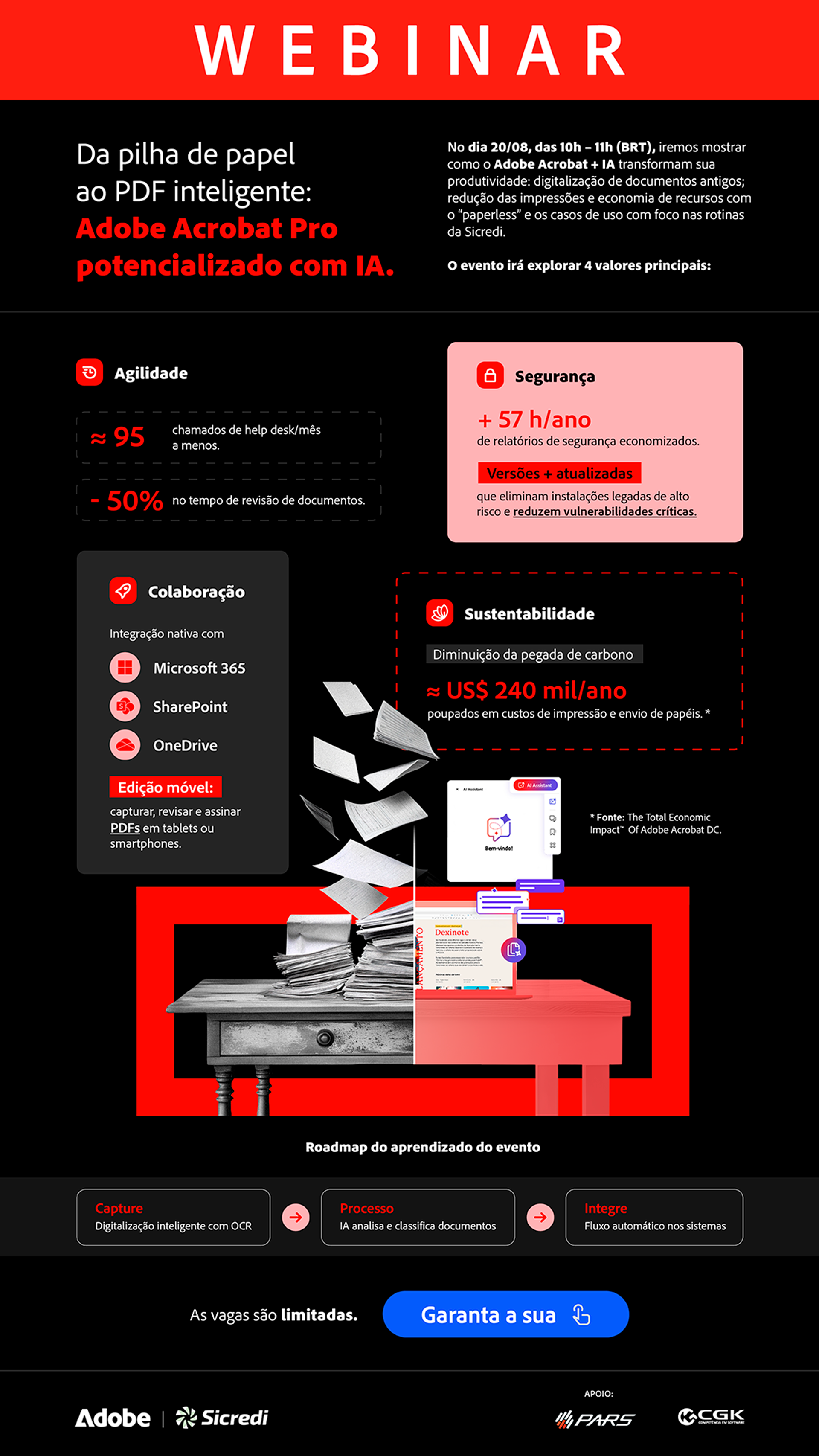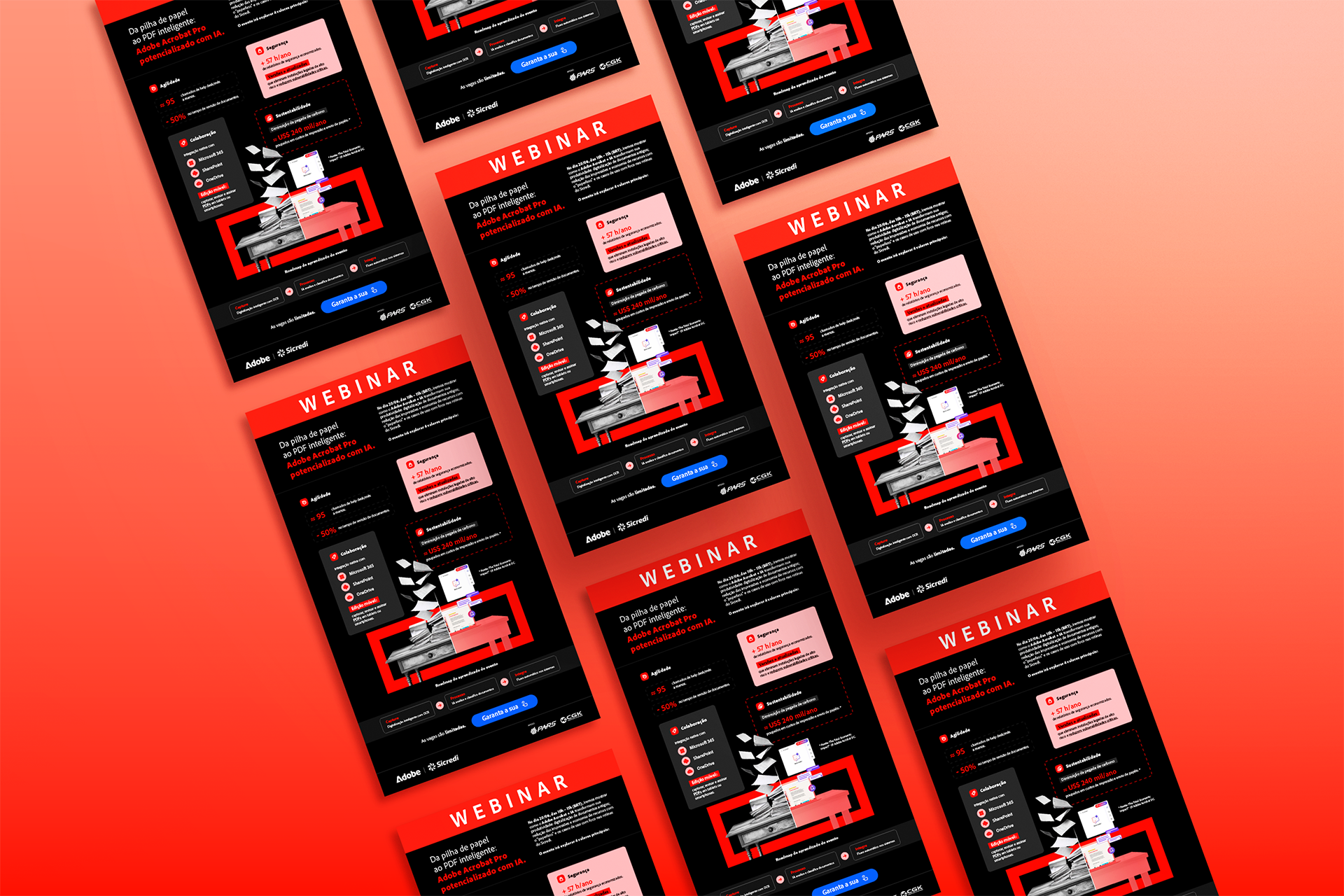 O infográfico foi desenvolvido para o webinar da Adobe em parceria com a Sicredi, com o objetivo de destacar os principais benefícios do Adobe Acrobat Pro aliado à Inteligência Artificial. O projeto buscou traduzir informações técnicas em uma narrativa visual clara e envolvente, evidenciando ganhos em agilidade, segurança, colaboração e sustentabilidade no ambiente corporativo.