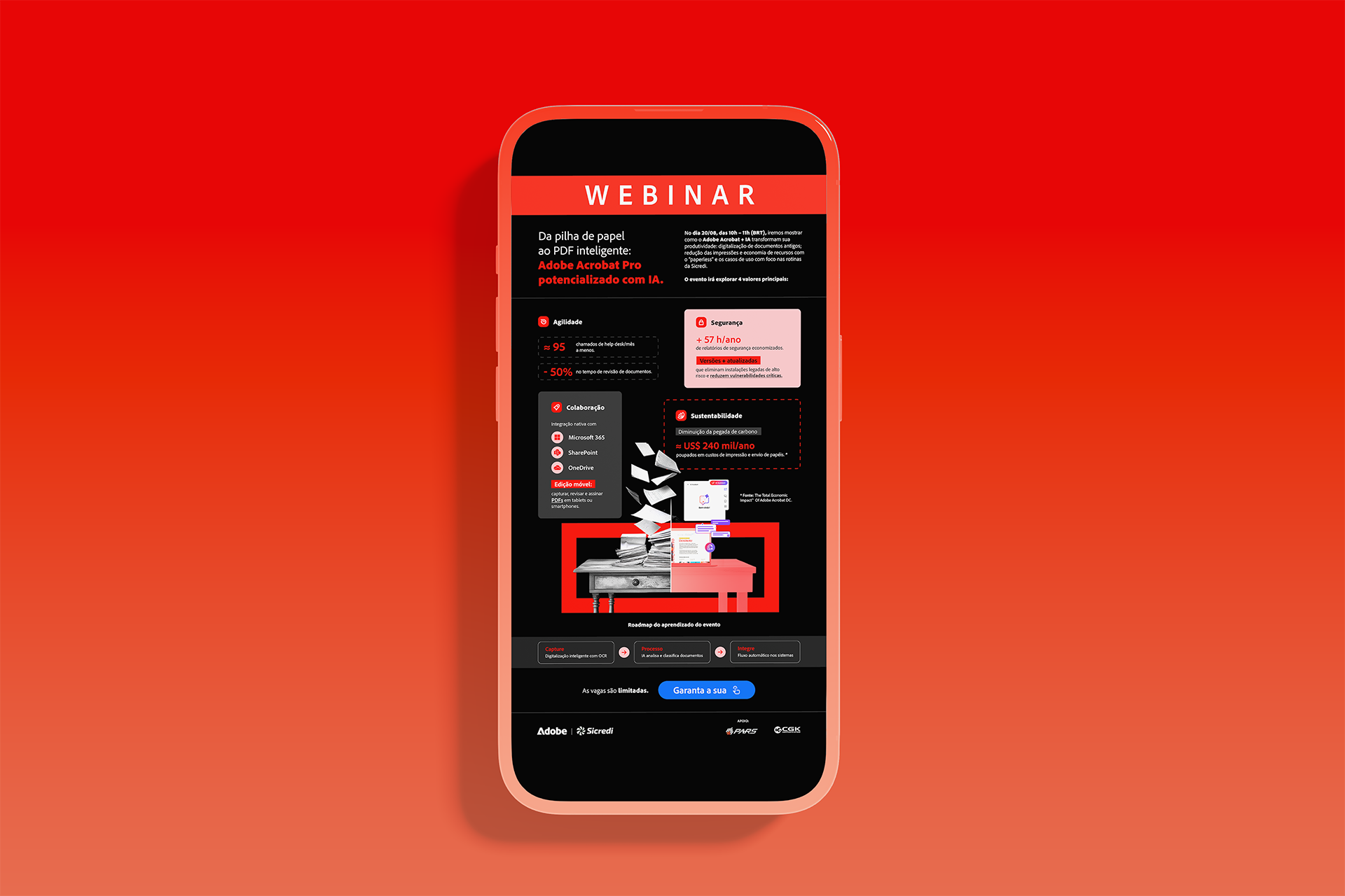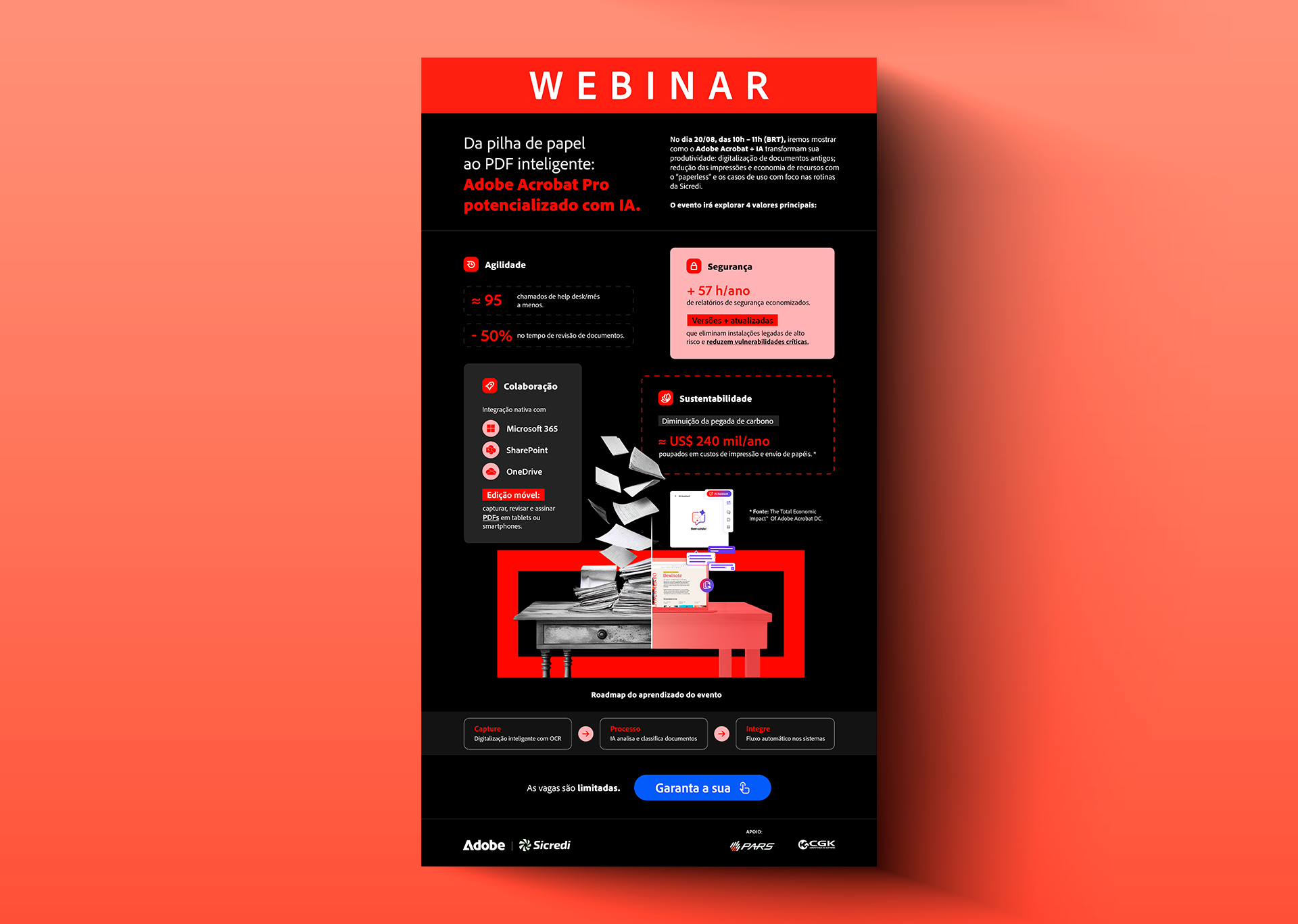 The infographic was developed for Adobe's webinar in partnership with Sicredi, with the goal of highlighting the main benefits of Adobe Acrobat Pro enhanced with Artificial Intelligence. The project aimed to translate technical information into a clear and engaging visual narrative, showcasing improvements in agility, security, collaboration, and sustainability within corporate environments.