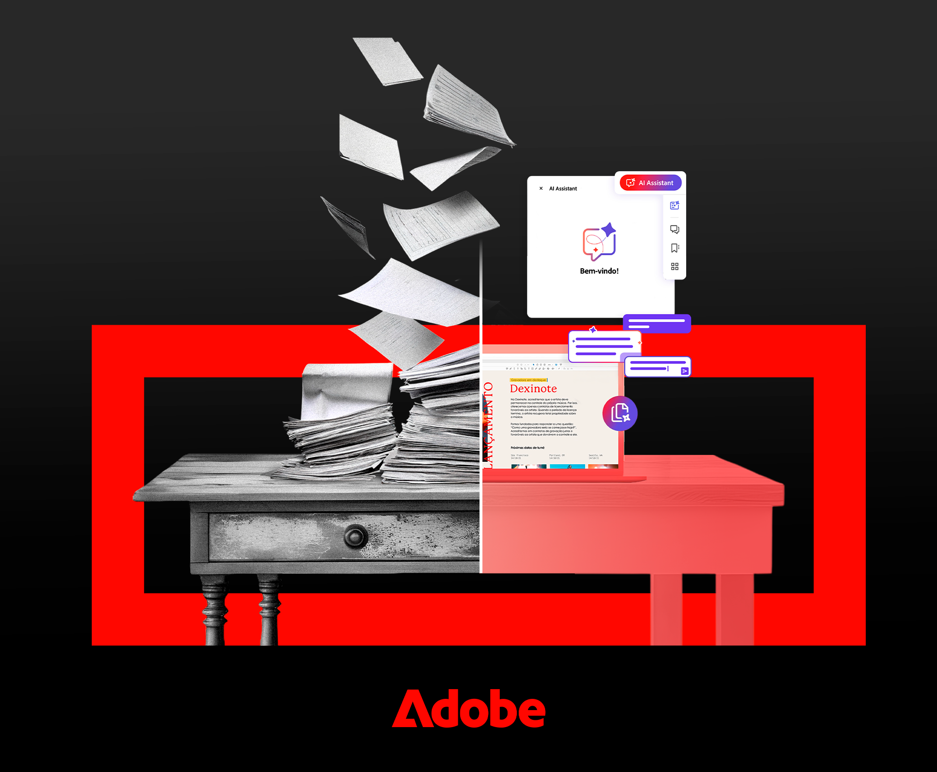 A composição gráfica explora o contraste entre a era do papel e a era digital, reforçando a proposta de transformação através do PDF inteligente. O design valoriza a leitura fluida, a hierarquia visual e o uso de cores estratégicas, garantindo impacto estético e didático ao mesmo tempo.