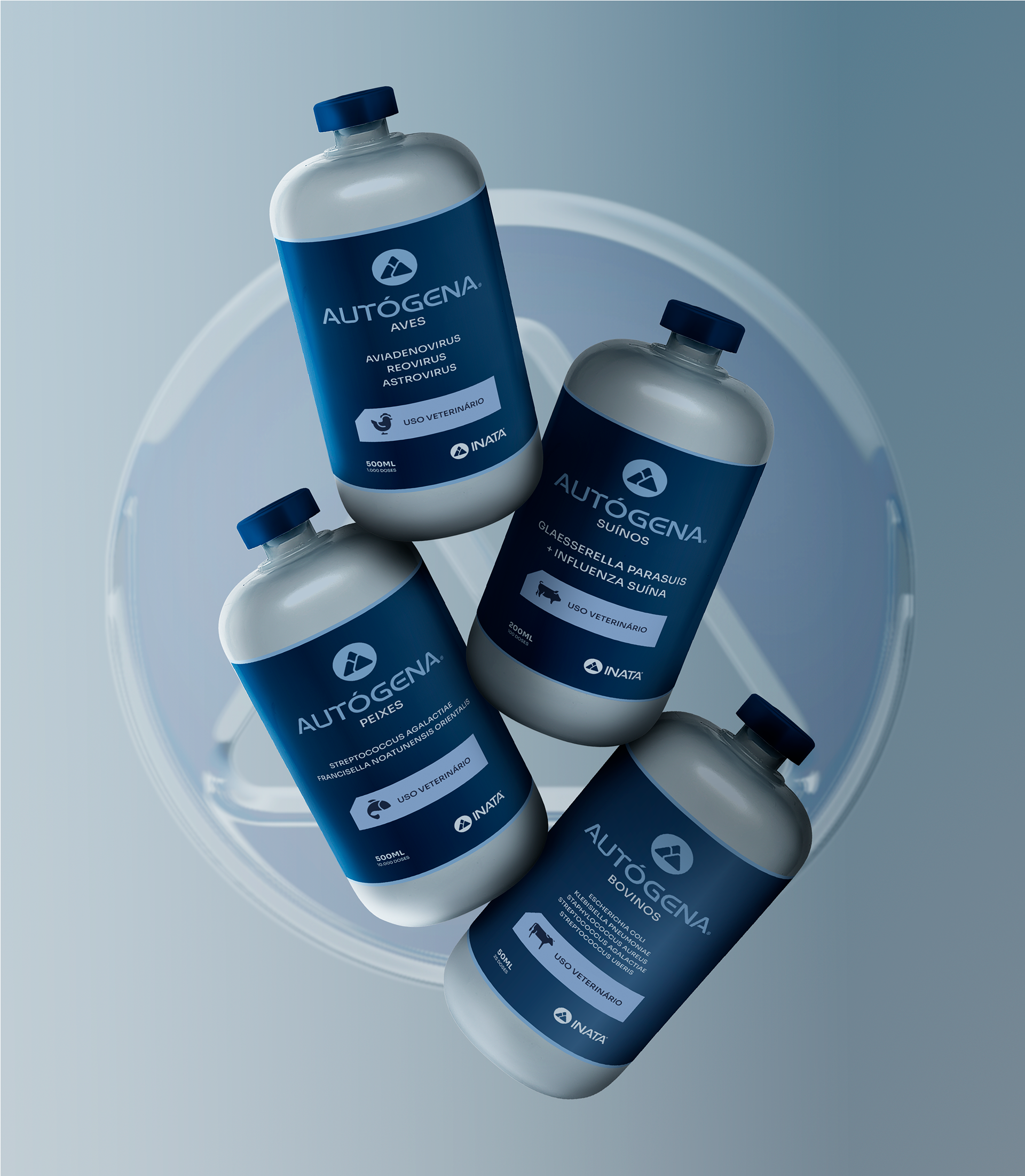 O círculo também está presente no dia a dia da INATA e no universo laboratorial: lembra placas de Petri, tampas de frascos, tubos de ensaio e rotores de centrífuga, reforçando a conexão da marca com a ciência e a precisão.